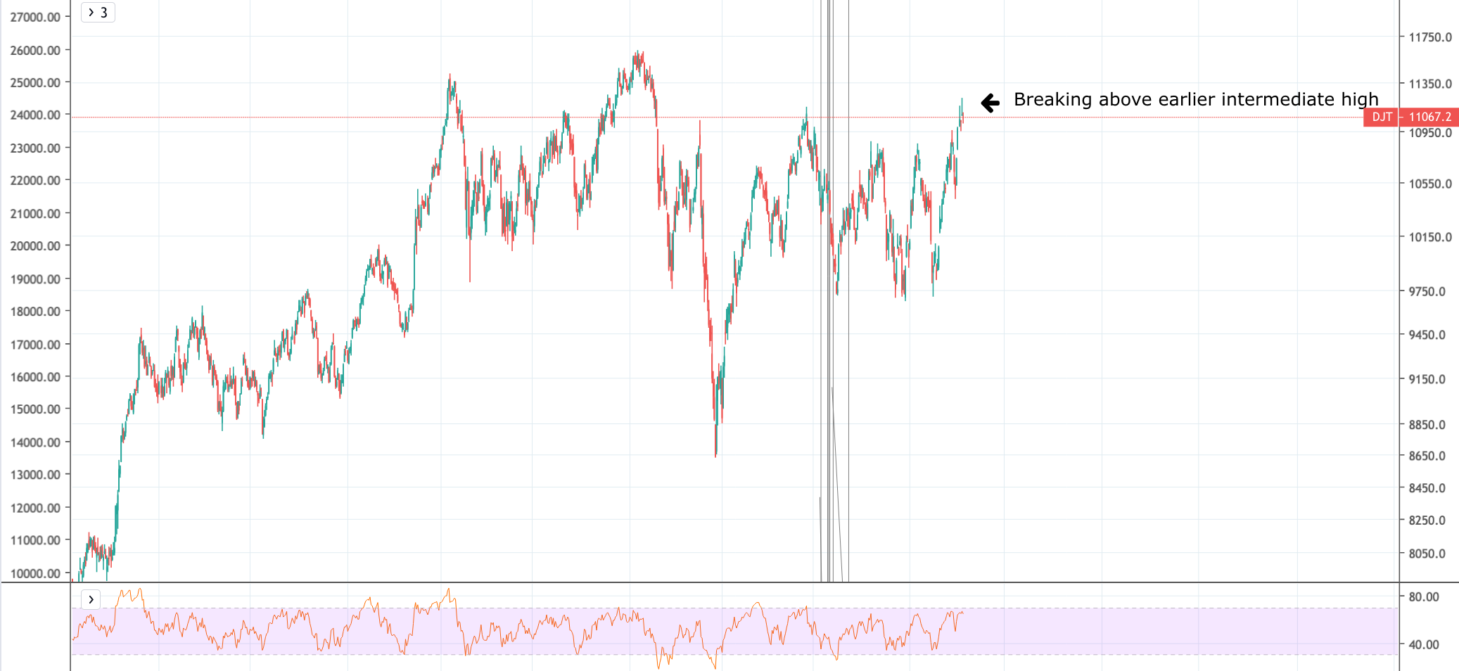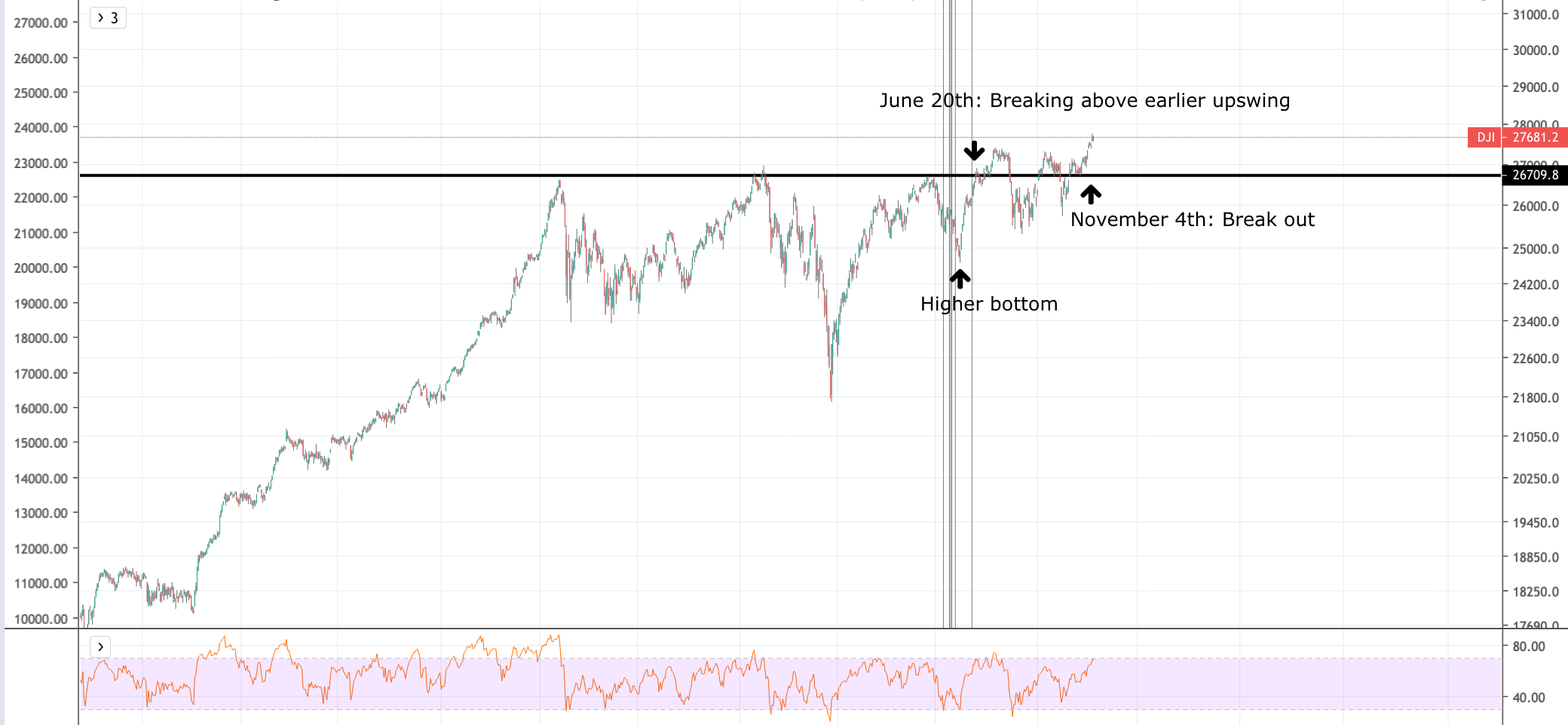 The market has been building a base on the Dow Jones Industrial average for quite some time now. It broke out of this base on november fourth. It actually broke above an earlier high, after making an earlier swing low even as early as june 20, as the picture show: