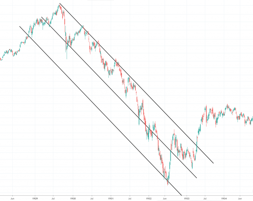 Sometimes an inner trendline develops inside a bigger trendline channel. As in the picture below of the steep downtrend that followed the crash in 1929, on the Dow Jones Industrial average.