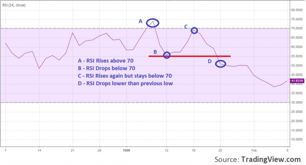 The RSI measures the speed and change of price movements. It can be used in several ways. Below is a picture of a “failure swing” strategy, which rely completely on the RSI for confirmation of reversals. And not price.