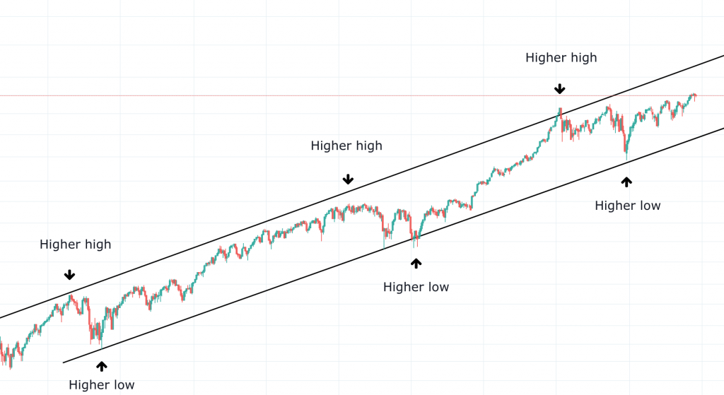 The underlying assumption of Technical analysis is that trends exists and that price moves in trends. A market trend is a price movement, characterized by rallies, going strongly in one direction. These trends can go either up or down. A downtrend is characterized by lower lows and lower highs. Conversely an uptrend is a series of higher highs and higher lows. Different trends exist on all timeframes at all times.