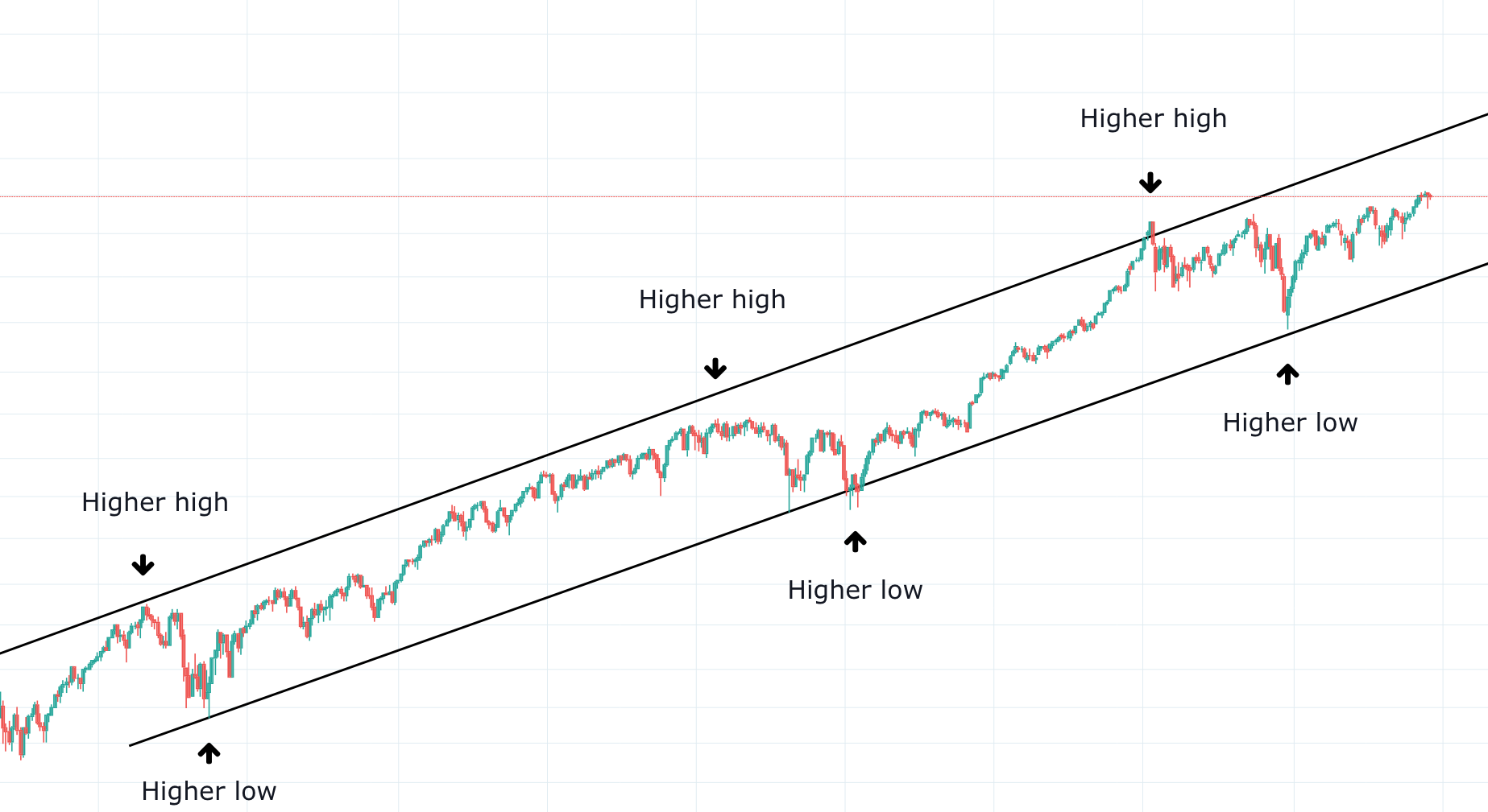 The underlying assumption of Technical analysis is that trends exists and that price moves in trends. A market trend is a price movement, characterized by rallies, going strongly in one direction. These trends can go either up or down. A downtrend is characterized by lower lows and lower highs. Conversely an uptrend is a series of higher highs and higher lows. Different trends exist on all timeframes at all times.