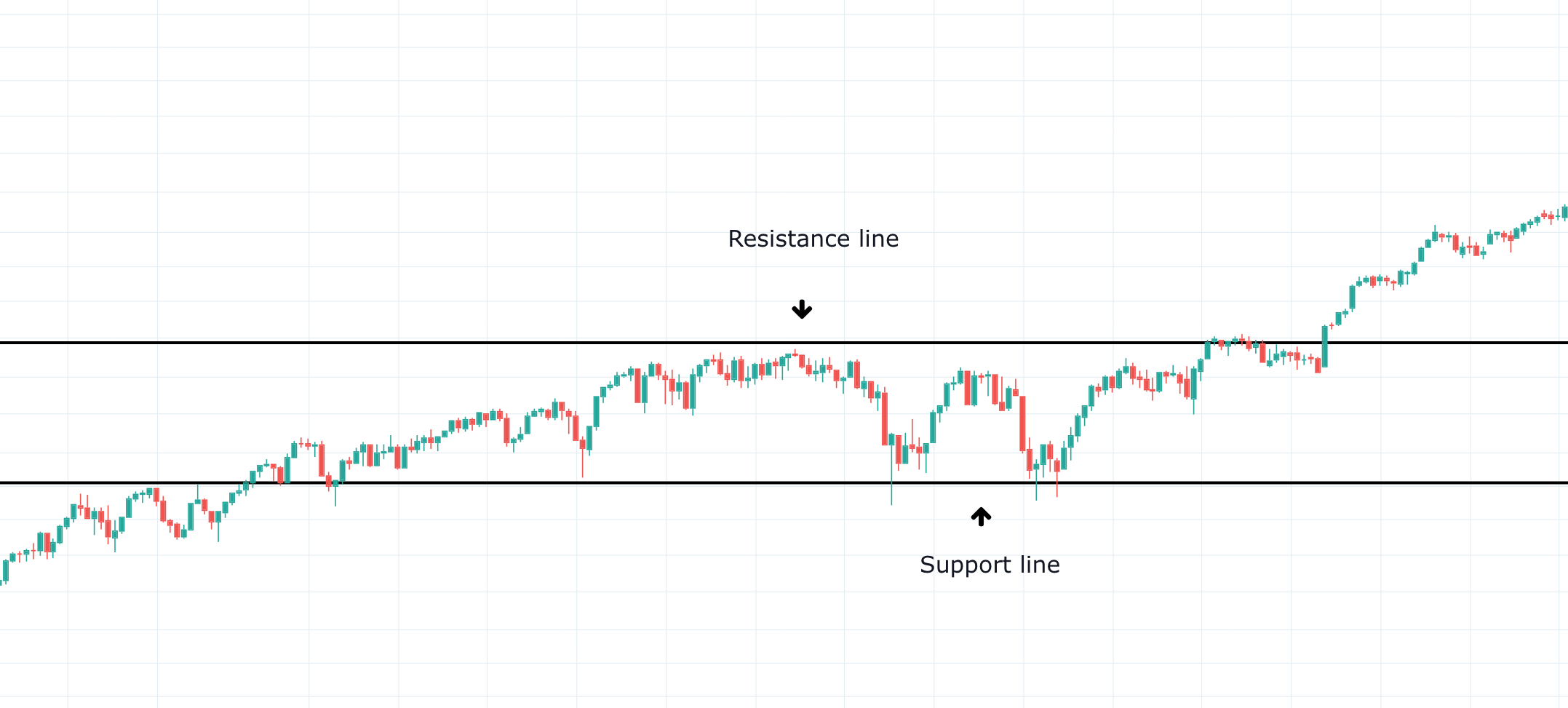 Support and resistance are essential to technical analysis. And a lot of strategies are based on these simple premises. They are areas acting as barriers for price. Support is where a downtrend expects to stop or pause. Because demand is present at this line. Resistance works the same way, but above price, at levels where lots of supply are present. Some traders trade the zigzagging moves in between support and resistance. While other traders focus on breakouts and breakdowns of these levels.