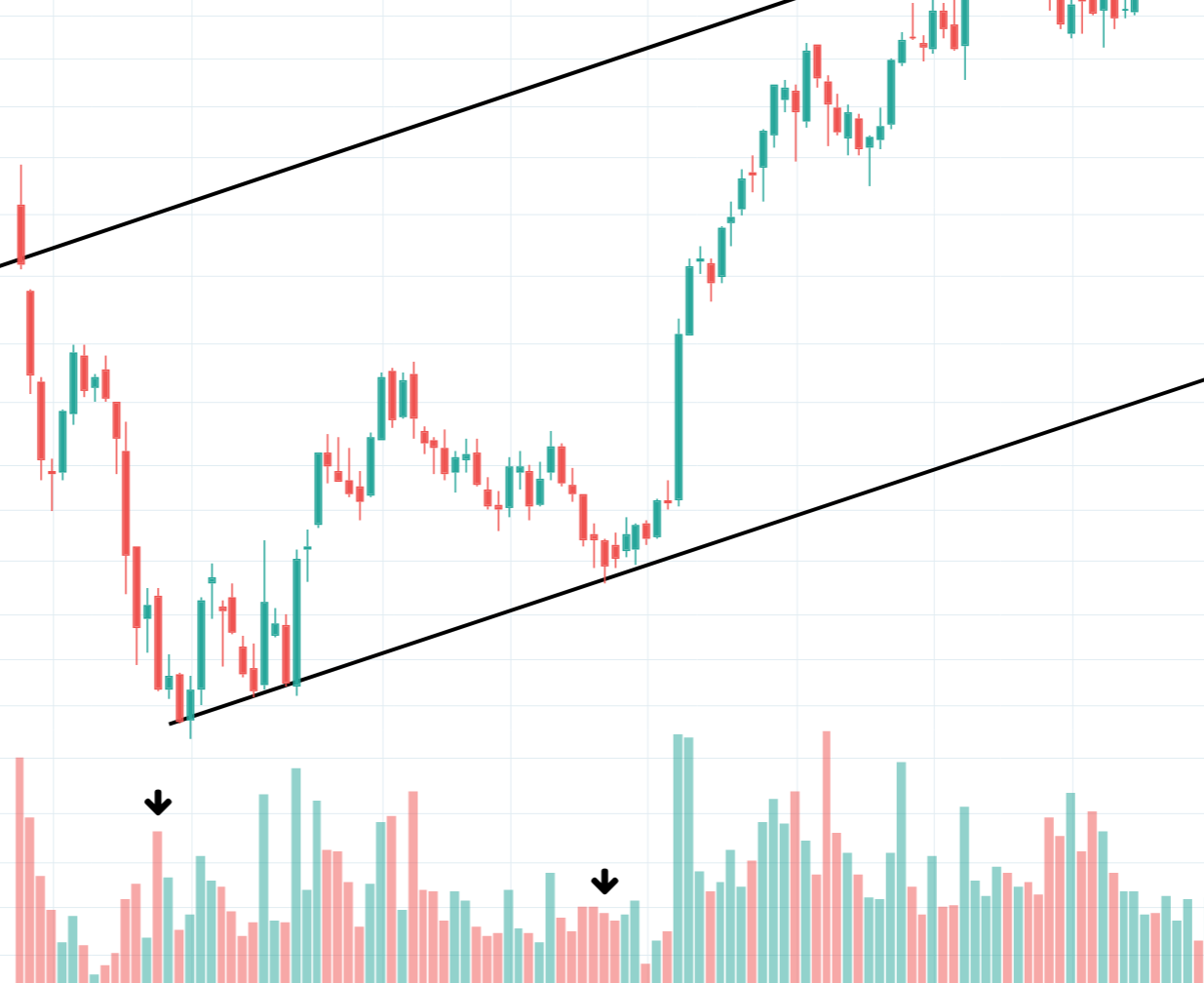 Volume gets used in a variety of ways, to find out the relative importance of trades. Volume measures the number of trades and shares traded, in a certain security, at a certain time. But it can also be the volume of an entire market, like an average. All buyers and sellers contribute to the total volume of trades. For example, if there are ten trades in a day, the volume is ten. Below is a decline on Facebook‘s chart in 2012-2013. Notice how the volume was lower on the second low. Indicating weakening selling pressure.