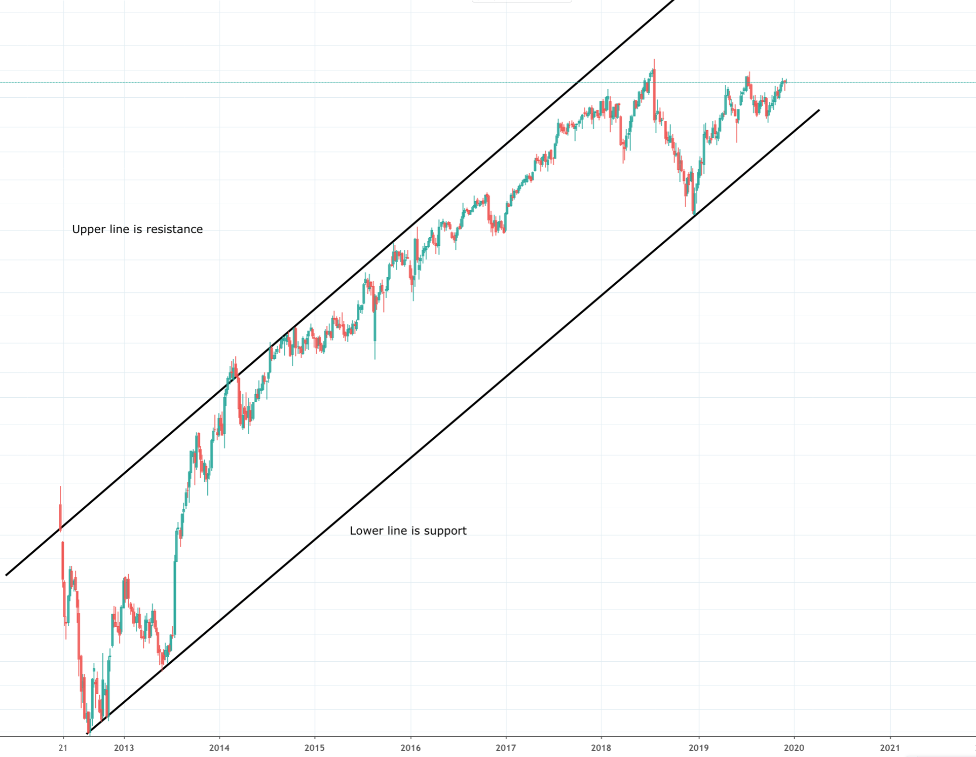 A trendline is a very simple tool and therefore one of the best. Because its strength lies in its simplicity. You can clutter your brain with all kinds of lines and indicators on your charts. But simple is often best. Therefore a simple trendline gives clarity and perspective. Below is an example of Facebook, trading between two trendlines, on a long term chart.