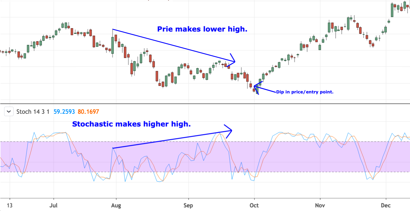 The creator of the Stochastics indicator said “Stochastics measures the momentum of price. If you visualize a rocket going up in the air – before it can turn down, it must slow down. Momentum always changes direction before price.”