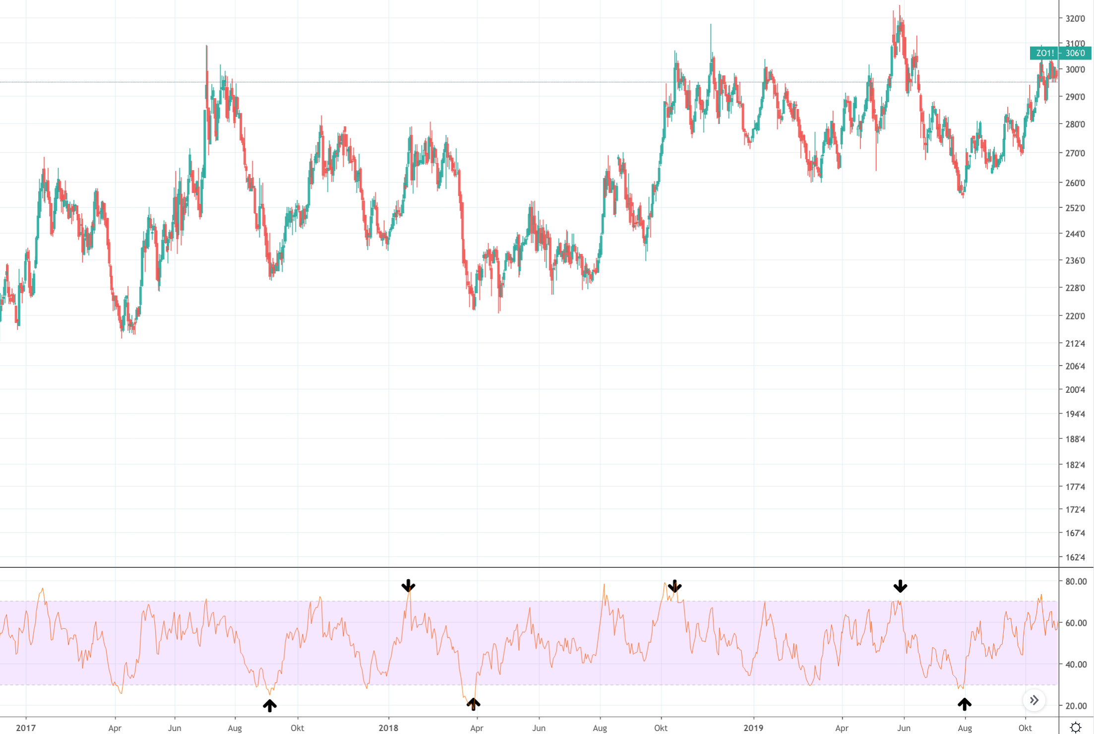 The RSI measures the speed and change of price movements. It can be used in several ways. Below is a picture of a “failure swing” strategy, which rely completely on the RSI for confirmation of reversals. And not price.