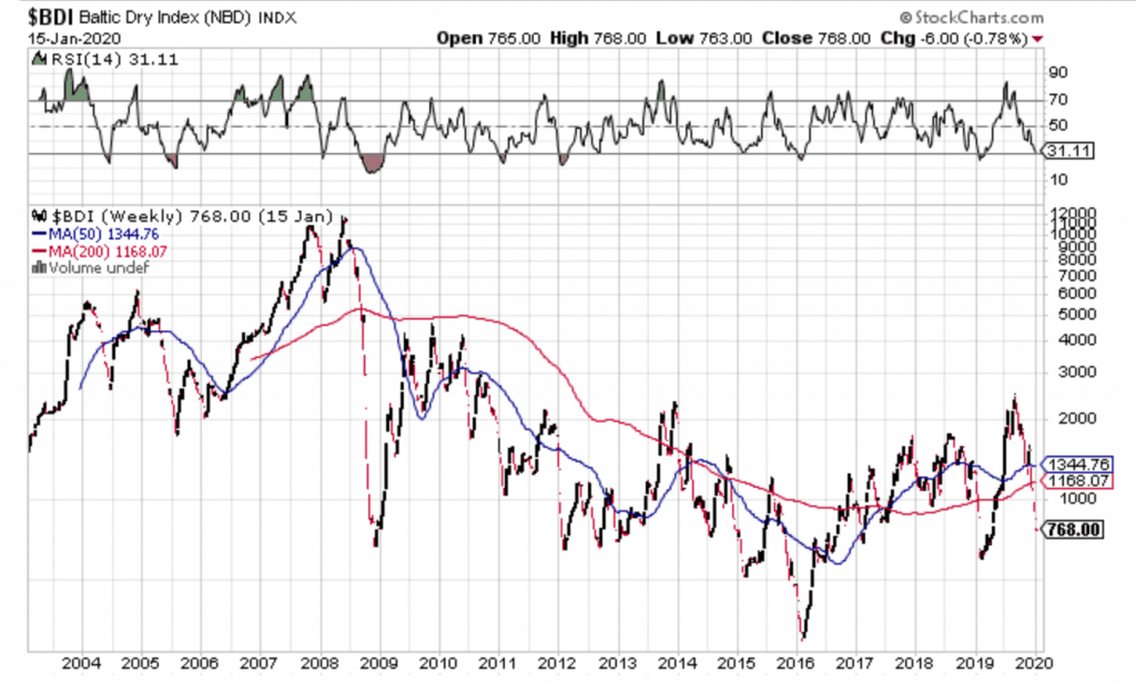 It is worth noting that in the aftermath of the recession in 2008 the BDI did not recover. But the S&P did. And the BDI really hasn’t recovered until about now, when I write this in early 2020. And since 2008 these two indexes have lost their connection with each other more and more. Some think that the downfall between 2008 and 2015, in the BDI, happened because of an excess supply of ships. Created in the boom years leading up to the recession in 2008. And this is an interesting thought that is quite possible.