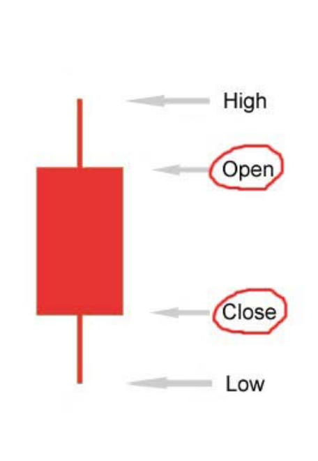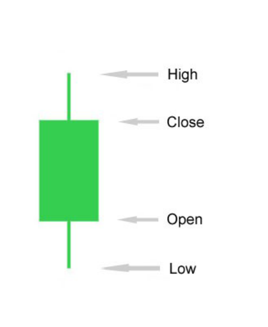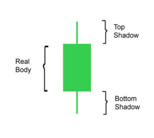 To the left is a typical green candlestick. The green color shows that it closed above its open. And the filled thick body, in the middle, is called the ”real body”. The beginning of the real body, shows the open, and the top of the real body shows the close.