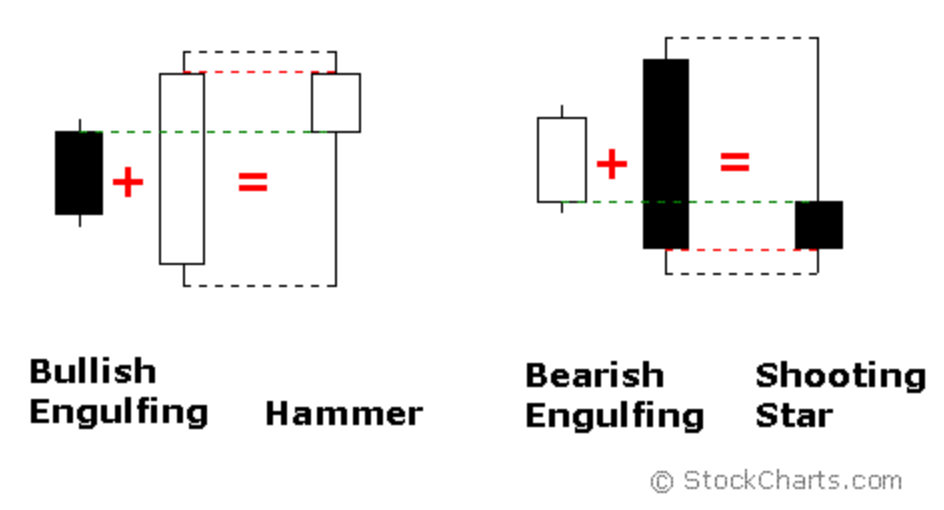 Another combination is to create a Shooting star from a bearish engulfing pattern, as above to the right. And several candlesticks can be combined into one long bullish candle as below.