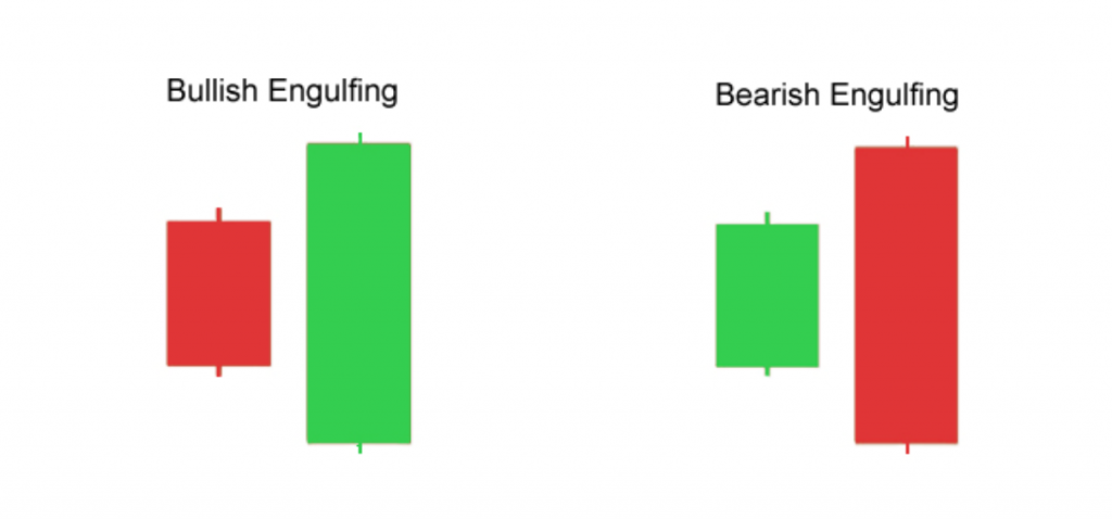 Above are two examples of “engulfing candles”. It is a very reliable reversal pattern. The high probability comes from the fact that buyers, or sellers, had a strong presence where they appeared. And this shows up in the form of a big engulfing candle. As a result prices are likely to keep on going in the same direction of the engulfing candle. In the case of a green engulfing candle, as in the example above to the left, it means that a lot of buyers were present.