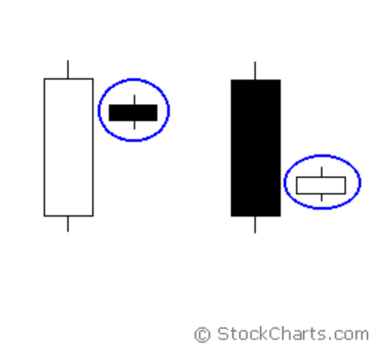 The Harami is a candle that forms within the body of a previous candelstick. In Japan Harami means “pregnant”. The second candle should be smaller than the first candle. Although the shadow of the second candle is not always contained within the first candle’s body. Dojis and spinning tops can appear in this position because of their smallness. It is generally considered to be a reversal pattern.