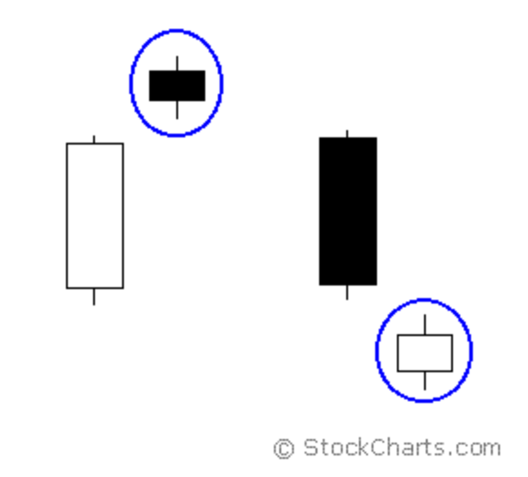 Above are two examples of “spinning tops”. They are quite similar to Dojis. Spinning tops have long upper, and lower shadows, but small real bodies. They show that both bulls and bears were active during the battle. But that it eventually ended up in a draw. These candles indicates weakness after a long advance. And strength when they appear after a long decline. They are indecision candles similar to Dojis.