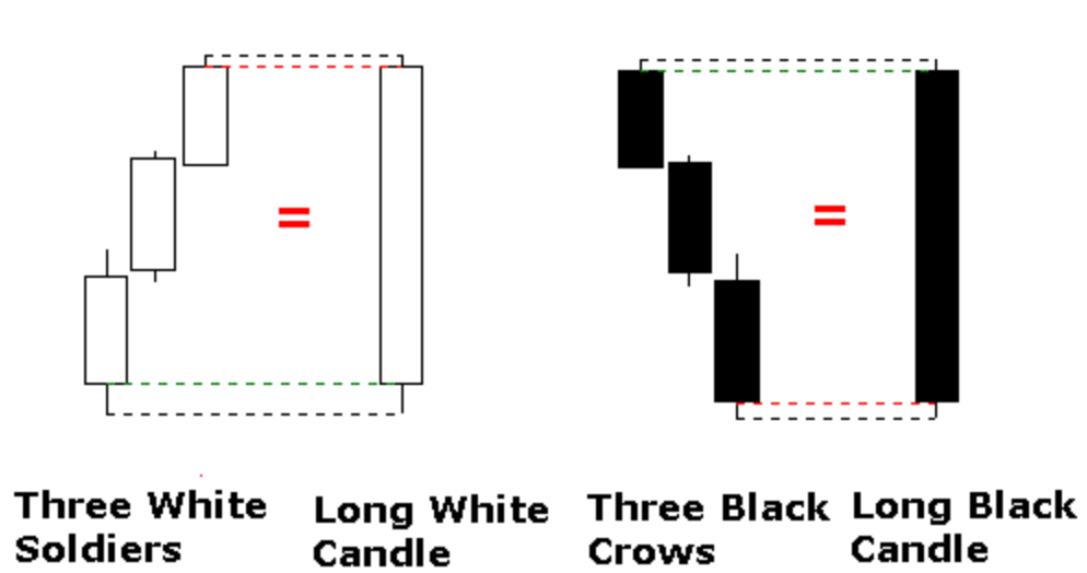 Above are “three white soldiers” that are combined into one large candle. This pattern appears when three small candles appear after each other and close on their highs. The three white soldiers convey bullish information. And they can be combined into one large bullish candle. This works if the closes are very near their highs, or lows. In that case they convey the same information as a long candle that close near its high or low.