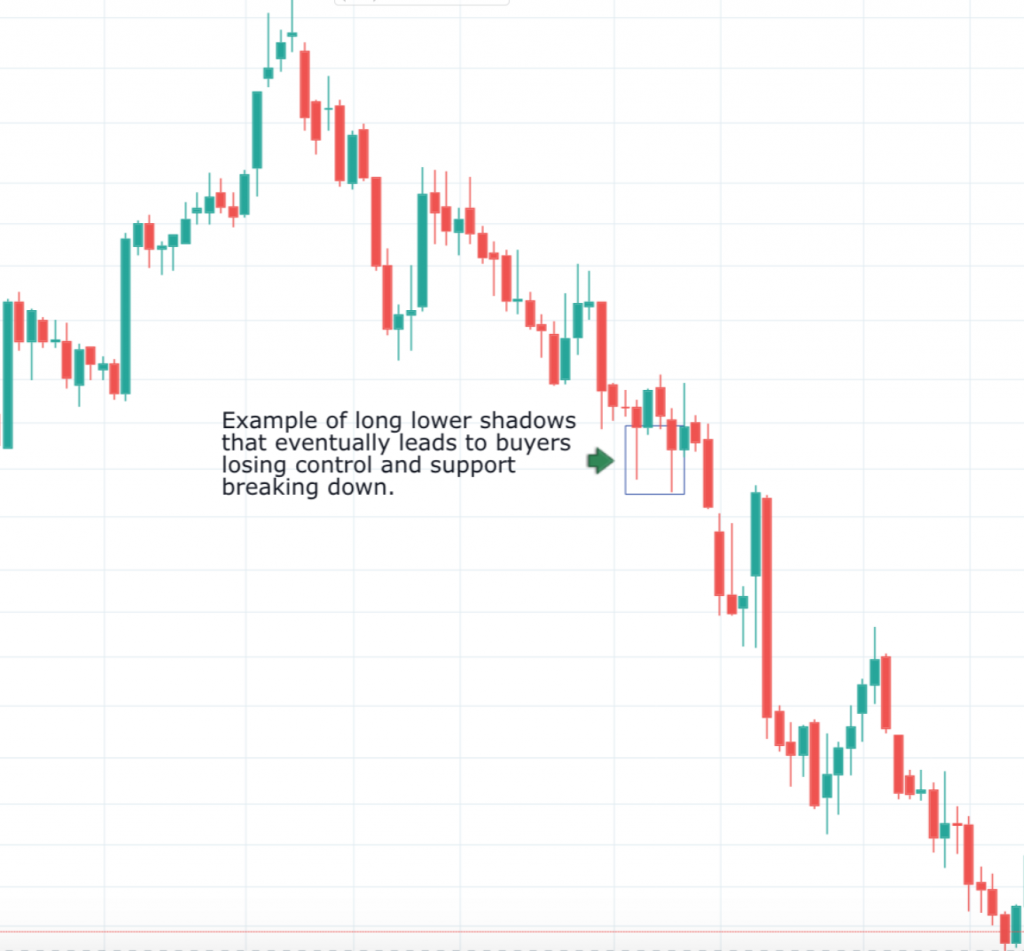 A single shadow on a single candle usually indicates a reversal. But multiple shadows after each other can mean a weakening of support. And that means that the support line is now beginning to weaken and potentially break. To the right is an example of how this can look. Multiple shadows showing vaining support. This means that sellers are trying to push prices down and buyers are gradually losing control of price. This eventually leads to a breakdown of support.