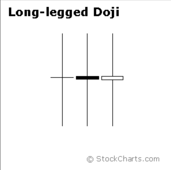 A long legged Doji has a long upper and lower shadow. And this candle shows indecision and stress. Because prices traded well below, but also well above, that session’s open and close, while the open and close were very close to each other. Therefore, after a volatile session, the candle finally closed virtually unchanged. Showing indecision and insecurity.