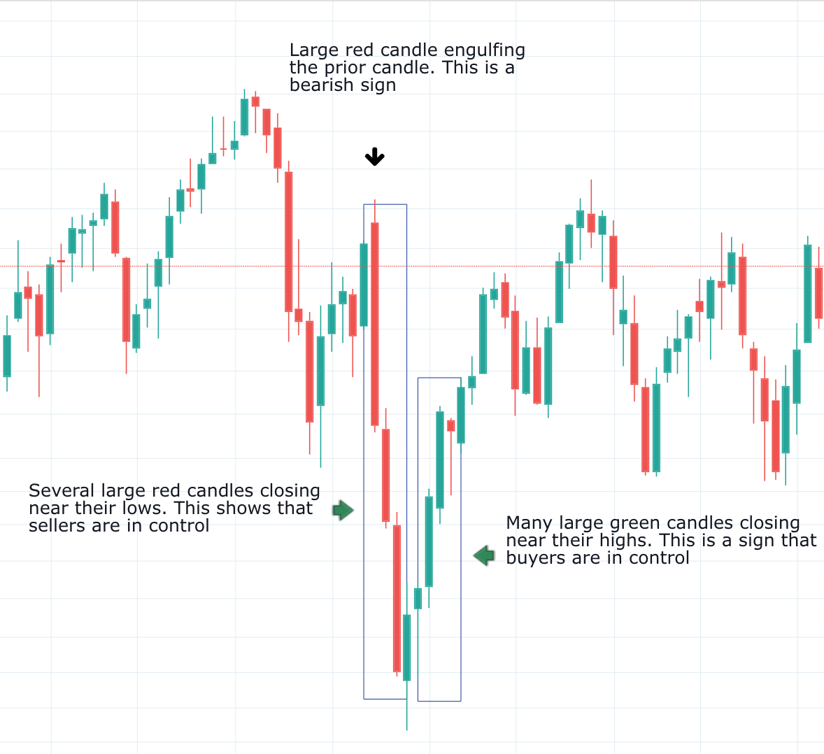 The rise and fall of green and red candlesticks is like a tug of war between buyers and sellers. If the close is near the high it means buyers are in control. Because sellers were not able to sell down the price even the slightest. Conversely, when there are lots of big red candles after each other, that close near their lows, then sellers are in control.