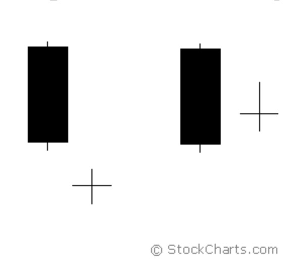 A candlestick that gaps up and away from a previous candlestick is said to be in ”star position”. Because it gaps away from a large candle and has a small real body. They appear isolated from the previous price action. Dojis, shooting stars, hammers and spinning tops can all appear as stars. Because they all have small real bodies and signal indecision.