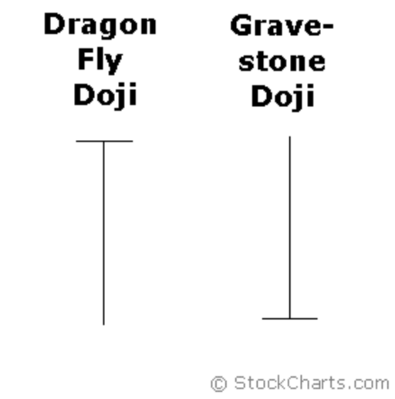 The Gravestone doji is a reversal pattern when it appears at the end of a trend. It looks like a gravestone. And it indicates a reversal if it happens at the end of a trend. The open, close and low are equally big. The high creates a long upper shadow, which makes the candle look like an upside down turned T.