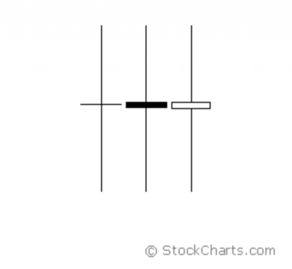The open and close, of a Doji, should ideally be at the same level. Because the Doji is then considered to be more reliable. A Doji shows a tug of war between buyers and sellers where both sides are insecure. And this eventually results in a standoff, which gives rise to the charcteristic cross shape above. Trading a Doji requires that you keep track of the prior trend. Because they are not as reliable when they appear in the middle of a trend, as they are when they appear at the end of a trend. The difficult part is to know the difference. Therefore, other indicators should be used alongside candlesticks as well, to study the overall trend.